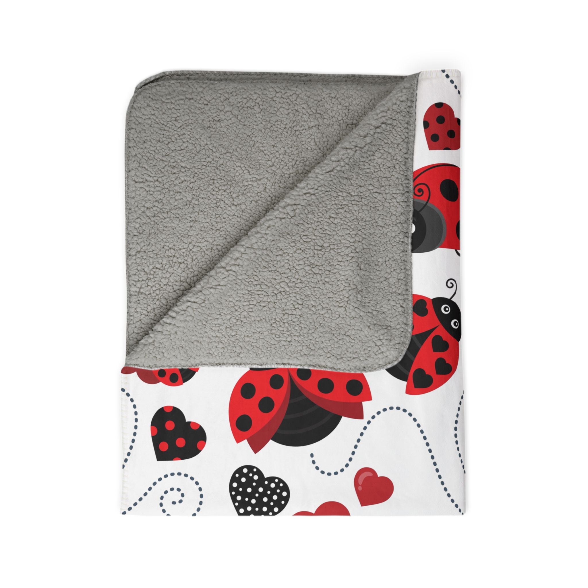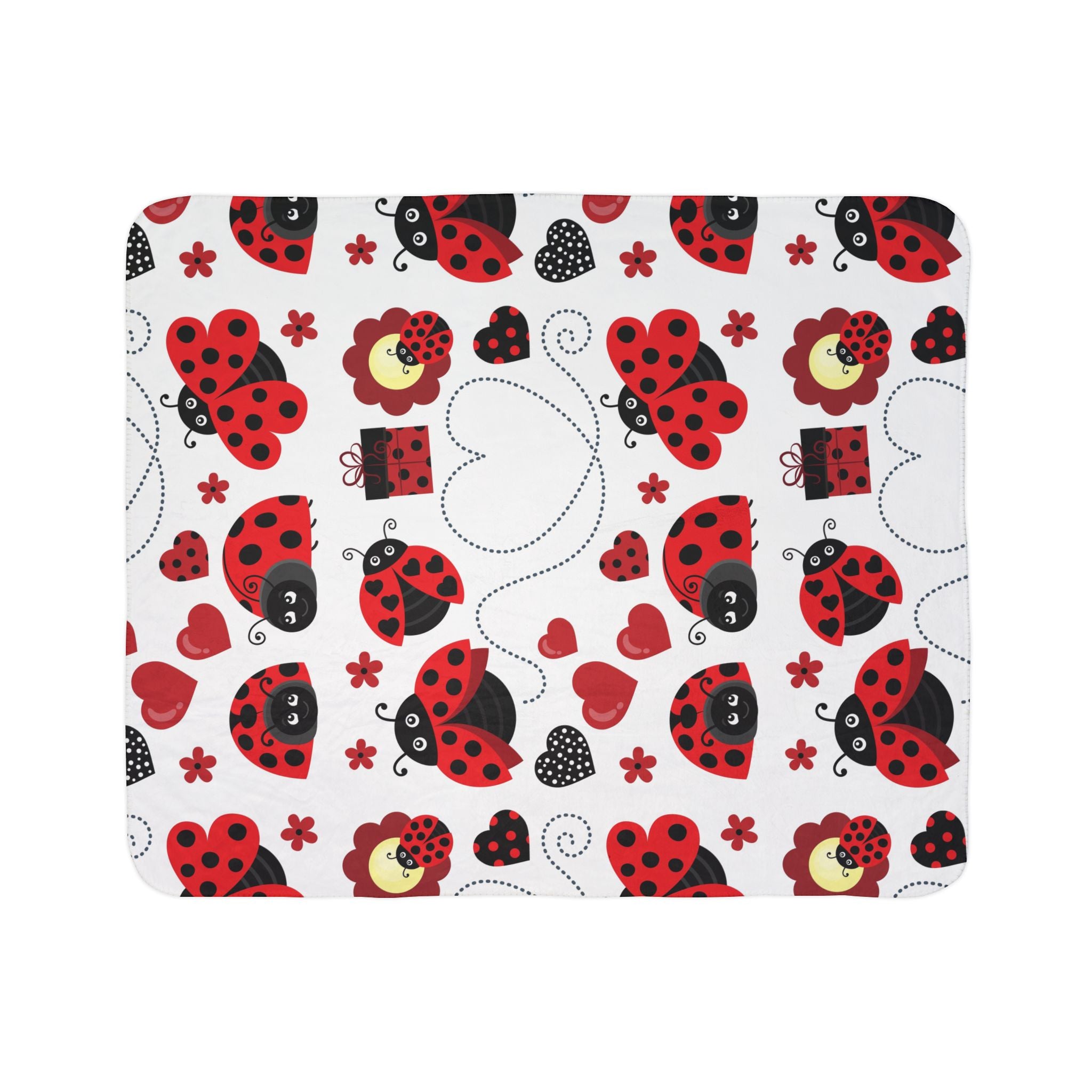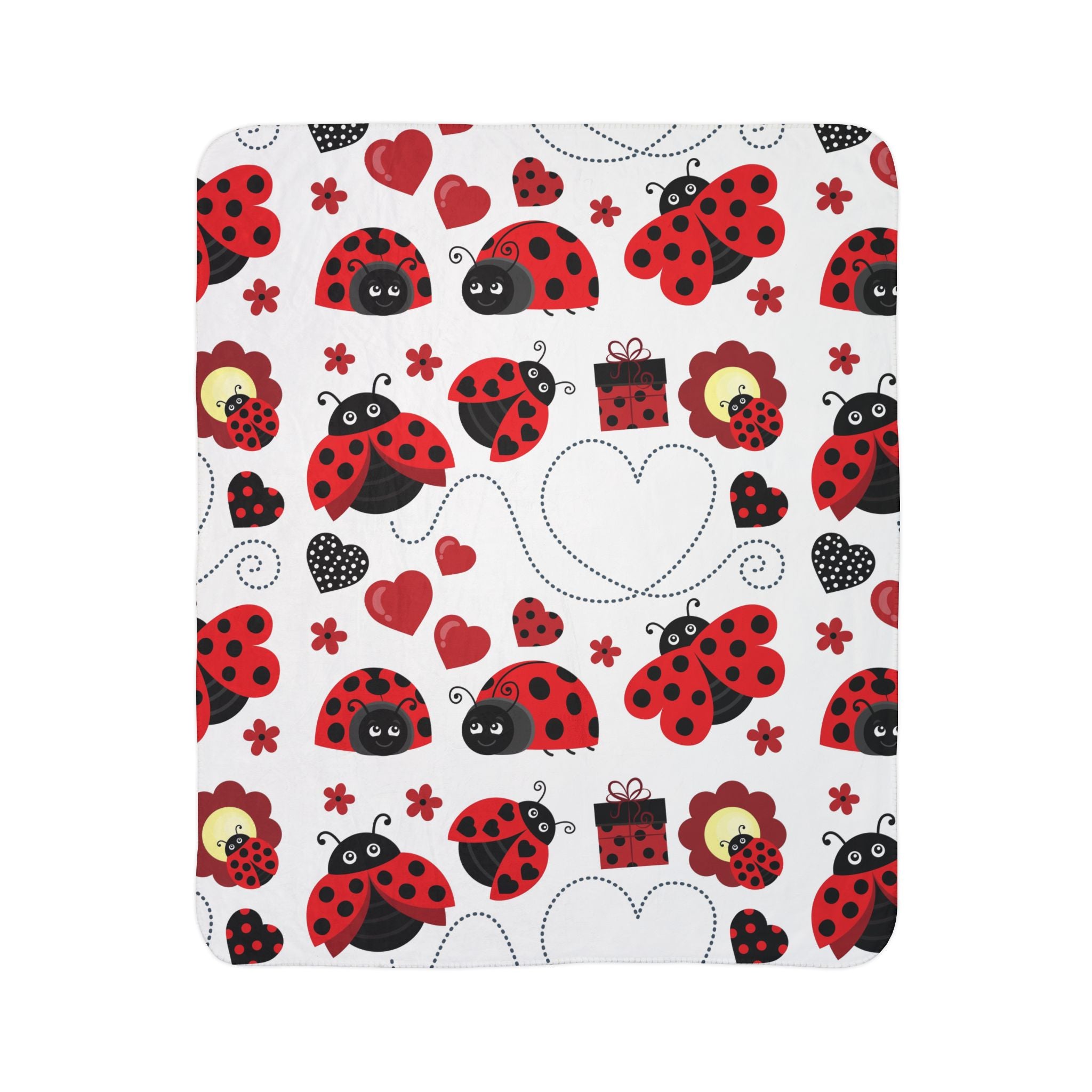 Curl up with a cozy, playful sherpa blanket that feels like a warm hug. Soft, plush fleece on both sides cradles you while bright, cheerful ladybug motifs dance across a clean white field — tiny hearts, gifts, and dotted flight trails add a handcrafted, whimsical touch. It’s the kind of throw that turns quiet evenings into small celebrations: movie nights, bedtime stories, or curling up with a book. Light enough to carry between rooms, yet dense and warm when you need it most. The hemmed edges and matched seam thread keep the design looking tidy after repeated washes. For anyone who loves charming accents and tactile comfort, this blanket brings a daily bit of delight and familiar warmth to the couch, nursery, or reading nook.